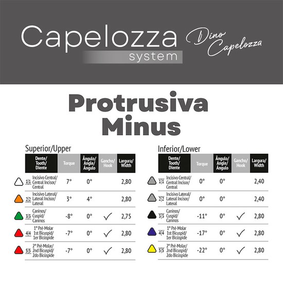 Capelozza Protrusiva Minus: Foi concebida para uso no tratamento compensatório das más oclusões do Padrão Face Longa, quando o objetivo é evitar protrusão em ambos os arcos dentários, admitindo um ângulo interincisivos aberto sem aumento ou com diminuição do perímetro dos arcos.